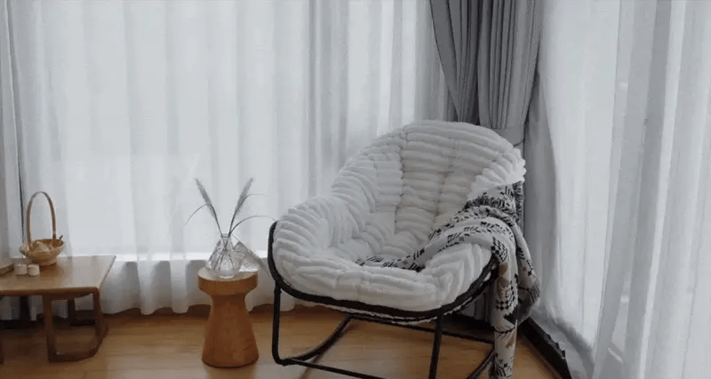 Umhüllt von samtweichem Stoff und gefüllt mit einer flauschigen, wolkenweichen Polsterung, lädt dieser Schaukelstuhl für drinnen zum Innehalten, Durchatmen und tiefen Entspannen ein.